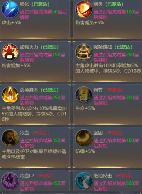 ② 【战技】:战技共27个,分为【精神技巧】、【战术技巧】、【晋升技巧】,没有等级,激活后永久生效,通过挑战烈焰龙域获得。战技通过各种条件进行触发,触发后可产生强大的技能效果。
