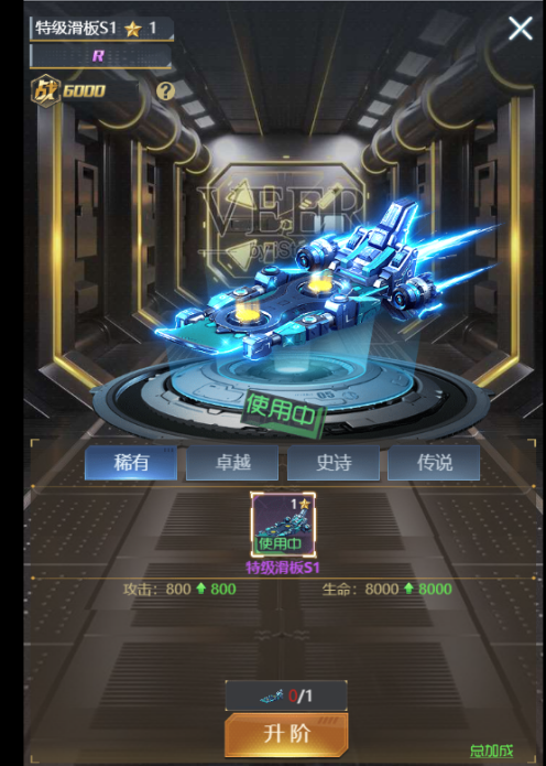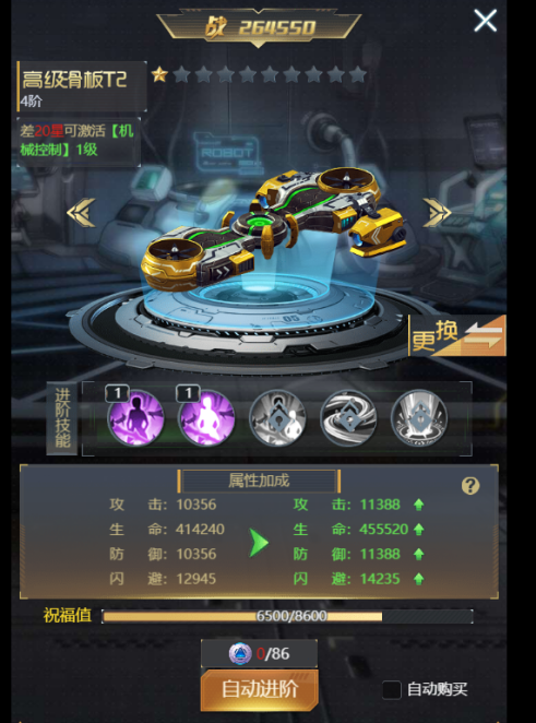 ⑤ 【进阶】:消耗飞行器模组提升飞行器的进阶星数,每满十星自动提升到下一阶,最高十阶。每进一阶都可解锁一个新的飞行器外观。进阶可为主角增加属性,还可激活强力的进阶技能。