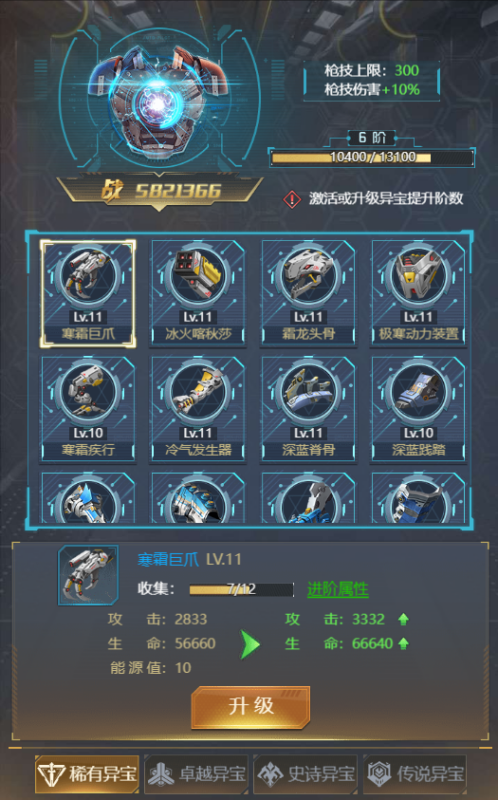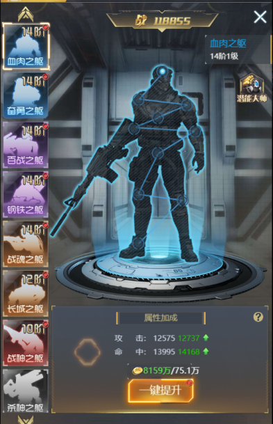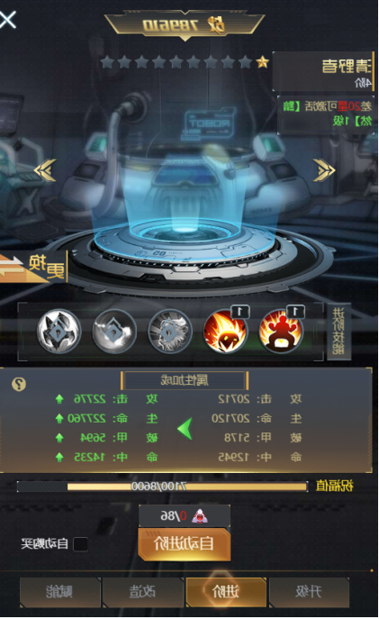 ④ 【升级】:消耗机壳配件提升机壳的等级,等级越高给主角增加的属性越多,等级提升还能激活及提升时装技能等级。