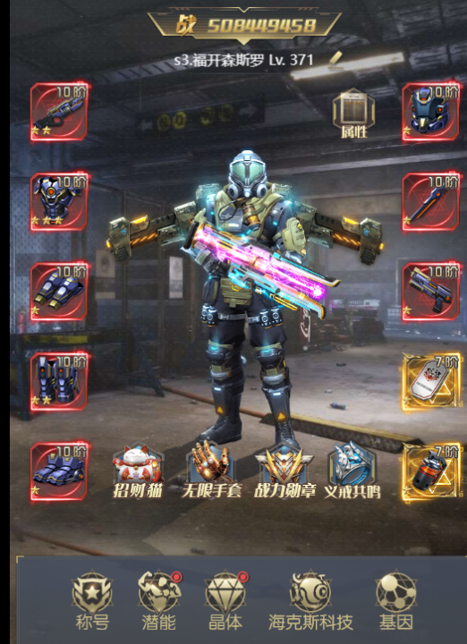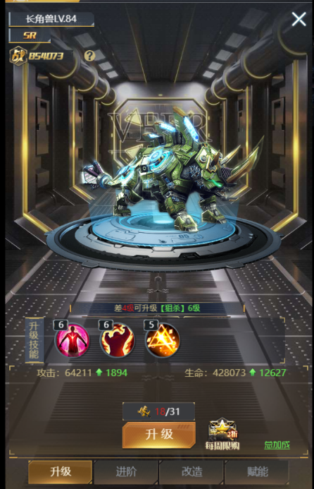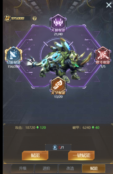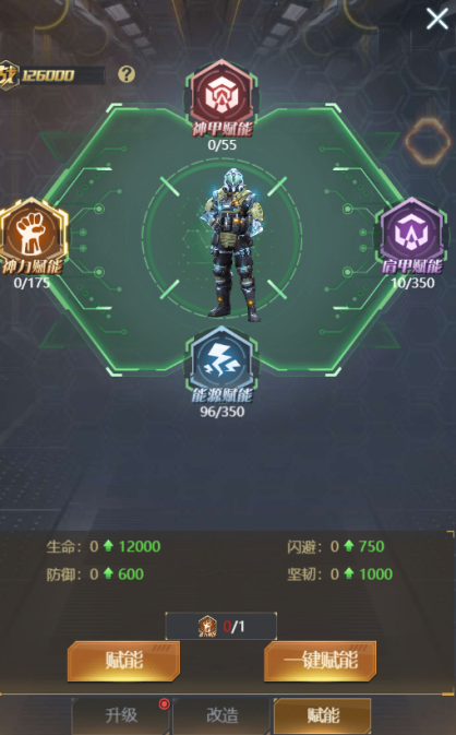 ⑥ 【赋能】:赋能分四个部位,每个部位的独立赋能,互不干扰,赋能所需分别对应不同的道具。赋能可为主角增加大量属性