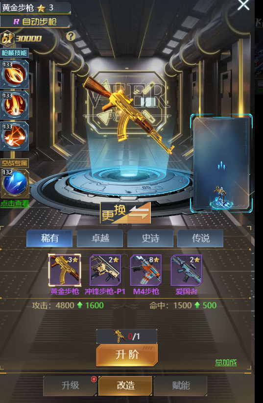 ④ 【升级】:消耗枪械配件提升枪械的等级,等级越高给主角增加的属性越多,等级提升还能激活及提升枪械技能等级。