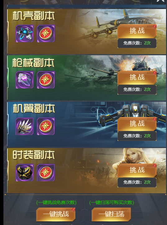 ① 每日历练包含八个小玩法副本,分别是【金币副本】、【枪技副本】、【飞行器副本】、【护卫副本】、【机壳副本】、【枪械副本】、【机械翼副本】、【时装副本】。