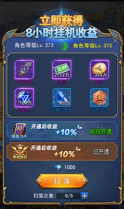 通过快速挂机可以马上获得8小时的挂机收益,由此可以获得巨额的经验、技能点、材料奖励,同时闯关关数越高获得奖励收益越高。