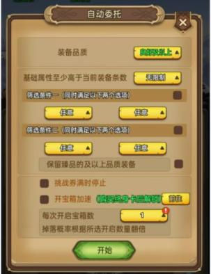自动开箱的功能按钮在宝箱数目显示的左边,每当需要开启时,请点一下,然后弹出上述界面。设定好需要筛选的装备之后点击“开始”,宝箱就会自动开始爆金币(?)了。而当你需要停止自动开箱时,只需要再点击一次齿轮,即可暂停。