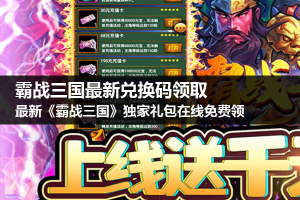 霸战三国兑换码在哪里?《霸战三国-送千元充值》三国威力加强版福利变态版本,曾官服千万活跃产品,当年“现象级手游”,超变态版正式来袭,上线送千元充值卡、送千万银币、送五虎上将、十连抽永久只需10元宝;上线元宝领到爽,武将抽到爽。我孙权以大小乔发誓,这游戏福利好、策略性高,游戏不好玩不收钱,我猜很多玩家都还不知道霸战三国这款游戏是可有些非公开的兑换码可供领取的,这些兑换码在游戏中是可以直接使用的,领取各种珍贵资源,98游戏这次就为小伙伴们整理了最新《霸战三国》独家礼包大全!快跟着小编一起看看吧。