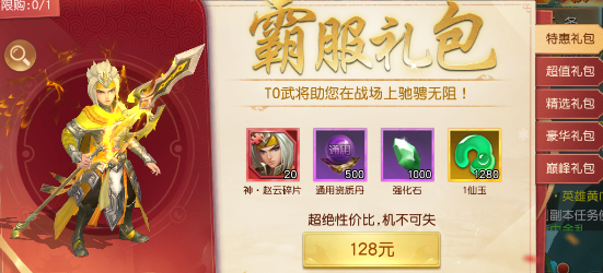 3. 霸服礼包,如果觉得神将降临投入比较大可以购买霸服礼包入手神·赵云,神·赵云在前期也是很强势的输出位之一。且礼包比较划算,性价比超高,阵容搭配上也很百搭。
