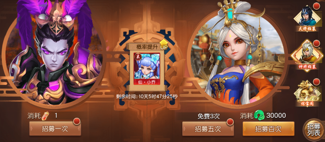 魔·吕布、鬼·郭嘉、仙·星彩、仙·吴国太、仙·小乔等次一级武将可以通过神将招募和令牌兑换获得。用来打辅助和次输出位。