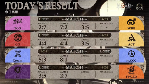 第一天成都GG vs FPX.ZQ第二局下半场,成都GG求生者齐心协力牵制,四跑裁定乾坤:开局杂货商追击小树林的杂技演员,杂技演员跳球规避藤蔓,借助弹射反走拉开身距。吃刀后,中场的弓箭手帮挡藤蔓并补上一箭,陪跑帮助杂技演员拉开距离。杂技演员顺利吃出闪现倒地。一救下椅,杂技演员连续规避抽刀和碎石,拖出化险为夷时间并使得气象学家修开自己的密码机前来陪跑。利用气象学家的陪跑,杂技演员连续转点,直到开门战才第二次被击倒。杂货商挂上杂技演员后传送,卡中场的佣兵极限救下杂技演员,杂技演员反拉干扰耳鸣,顺利地窖逃生。拿下四跑终结比赛。