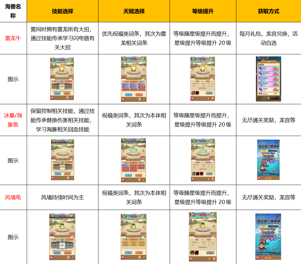 海兽的培养是为了后续神兽的出场奠定基础,海兽的等级决定神兽等级,二者相互绑定,所以海兽的培养只有两大重点,分别是等级和天赋以及技能的选择。等级提升需要足够的海兽经验,海兽经验的获取方式主要有,死神轮盘,每日/周/月海兽礼包。海兽天赋首选祝福类词条,其作用是为船长神器提供加成,增幅类词条只会为海兽自身加成。其中推荐且实用的海兽有以下:雷龙牛,冰暴鱼,海豚鱼,风墙龟。海兽玩法中有两个特殊之处,海兽继承功能以及技能传承功能。海兽继承目的是将海兽的天赋转移至另一只海兽,技能传承以消失本体海兽为代价学习指定技能,可以在海兽技能页面替换技能,会受到海兽等级限制以及学习技能次数限制。