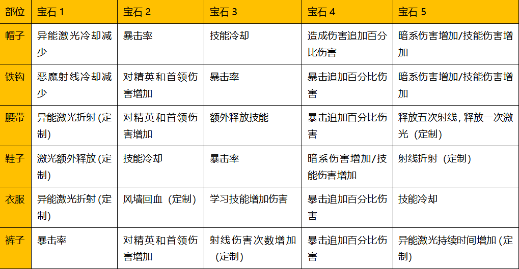 3.光暗同修宝石搭配与上述相似,不同的阵容选择相应的宝石搭配才能发挥出最大收益。其中通用宝石可以适应任意阵容,洗练可以留意以下词条。伤百,暴百,传送,学习技能增加伤害,额外释放,技能冷却,暴击率,对精英首领伤害增加,技能伤害。