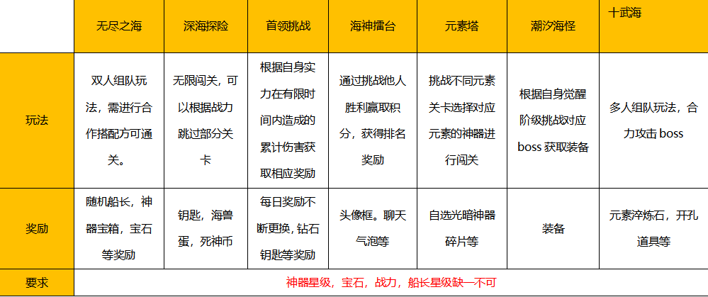为除主线之外的玩法如:无尽之海,深海探险,首领挑战,海神擂台,元素塔,潮汐海怪,十武海