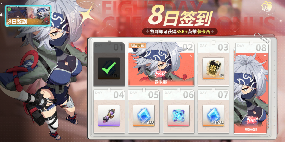 玩家每日登录游戏即可参与签到,连续8天签到可领取丰厚奖励。签到完成后,即可获得SSR英雄露米娜,并附赠其他资源奖励。
