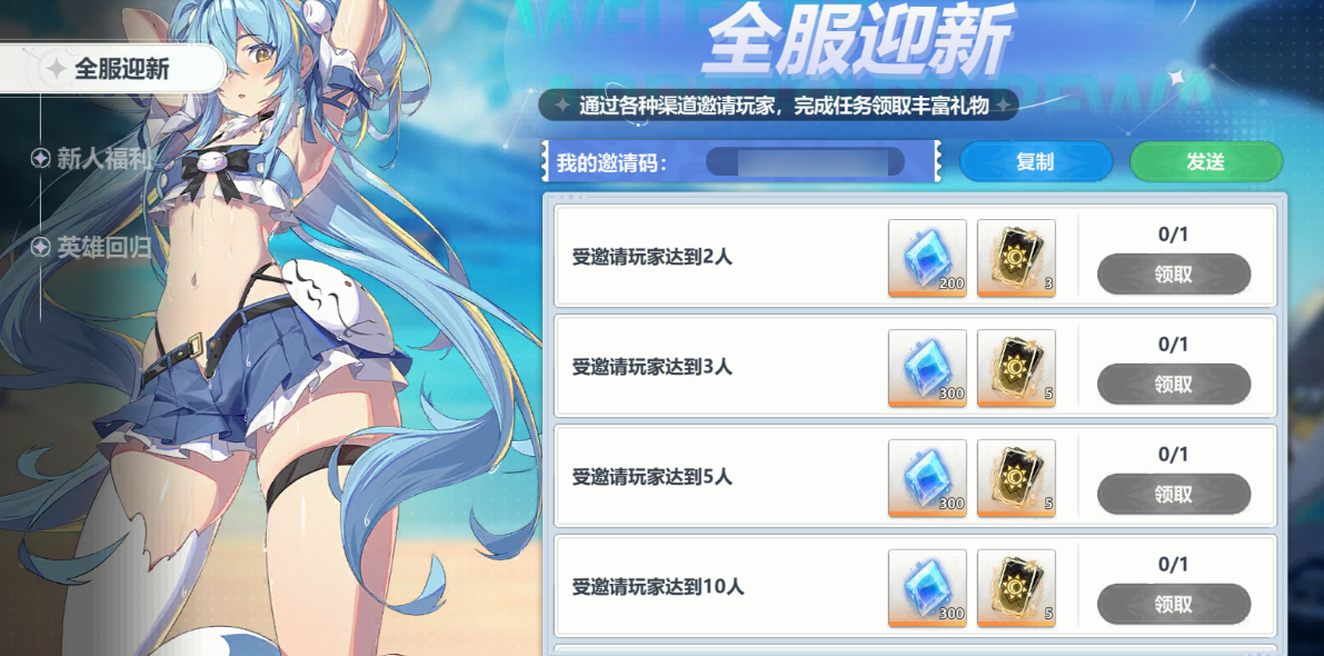 【注意事项】只有新创建且冒险通关不超过300关的角色,才可以在新人福利页面绑定邀请码噢!