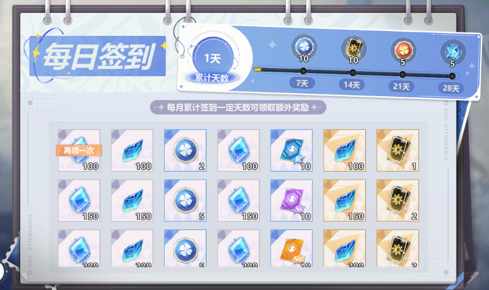 【每日基础签到】星钻*1300、进阶之源*1300、幸运银币*12、幸运金币*4、R品万能碎片*10、SR品万能碎片*10、SSR品万能碎片*10、SSR+万能碎片*10、高级契约*5、能源矩阵*3