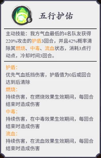 五行麒麟能够为己方清除多类型负面状态,同时提供较强的护盾,具有超强的保护作用。