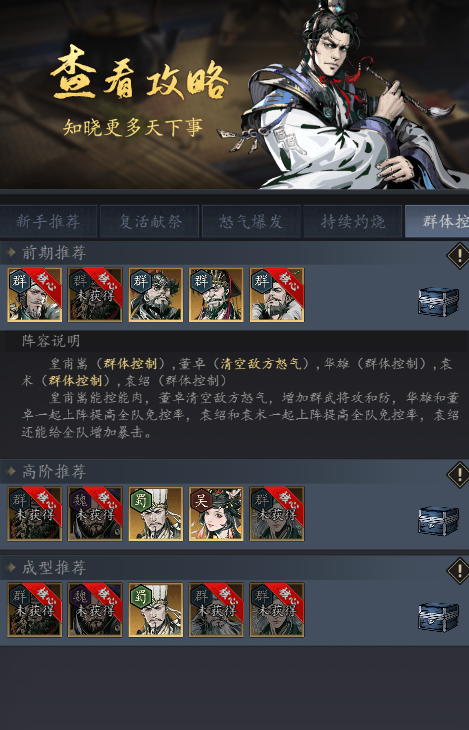1、前期建议玩家以推图为主,加快功能开启及角色等级,可以优先培养群攻角色,阵容选择上可以参考武将界面左下角的阵容,对应阵容点击开会有对应的组合说明。