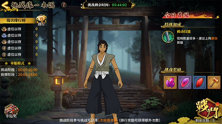 1.挑战缘一木偶分为单服模式与跨服模式,单服模式每周有7期boss,周一10:00-20:00可进行挑战,周二至周日0:00-20:00可进行挑战,跨服模式每周有3期boss。分别在周一、周三、周五进行挑战,挑战持续一天,每期boss挑战结束后可进行投掷,投掷结束后,可领取投掷奖励。