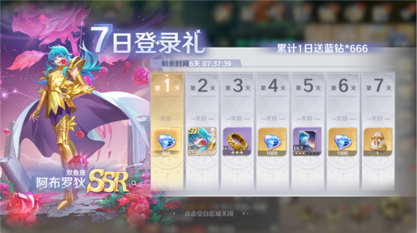 活动期间,次日登录即可领取黄金圣斗士SSR阿布罗狄,累计登录7天可领取自选3星SSR斗士、更有紫色圣器尼伯龙根指环、3星紫色究极之力和2666蓝钻等丰厚奖励,可以大幅度提升战力。
